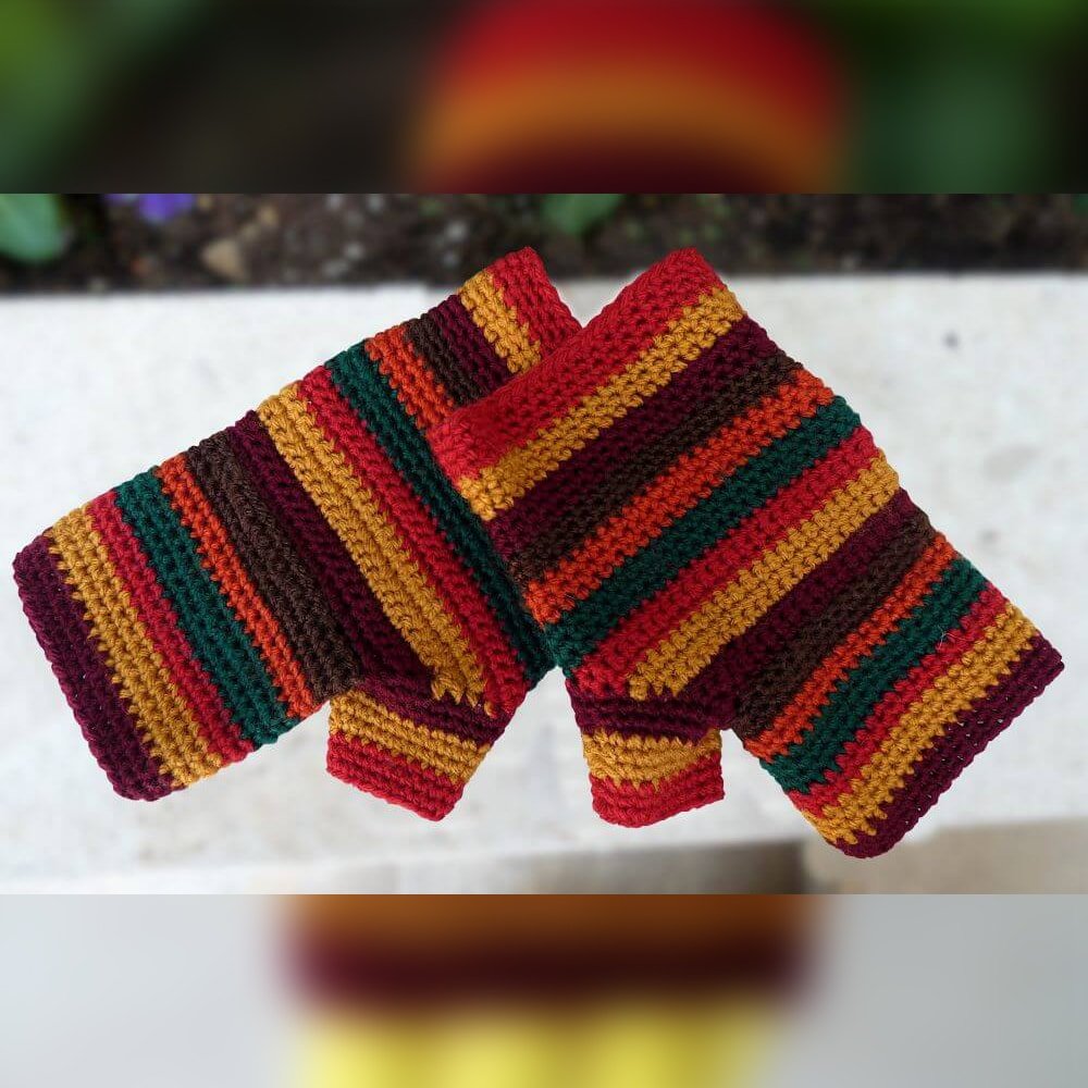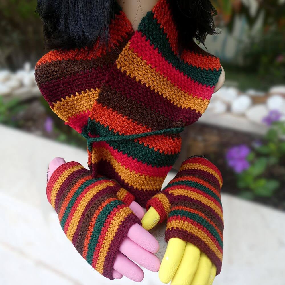 These crochet fingerless gloves are part of a coordinated crochet accessories collection that also features a snug ear warmer and a stylish scarf. Each item in the set is made with acrylic double knit yarn, and highlights creative variations of the double crochet stitch, bringing a cohesive and polished feel to your handmade pieces. Whether you choose to make only the gloves or complete the entire set, you’ll enjoy a consistent design style that ties your winter accessories together beautifully.