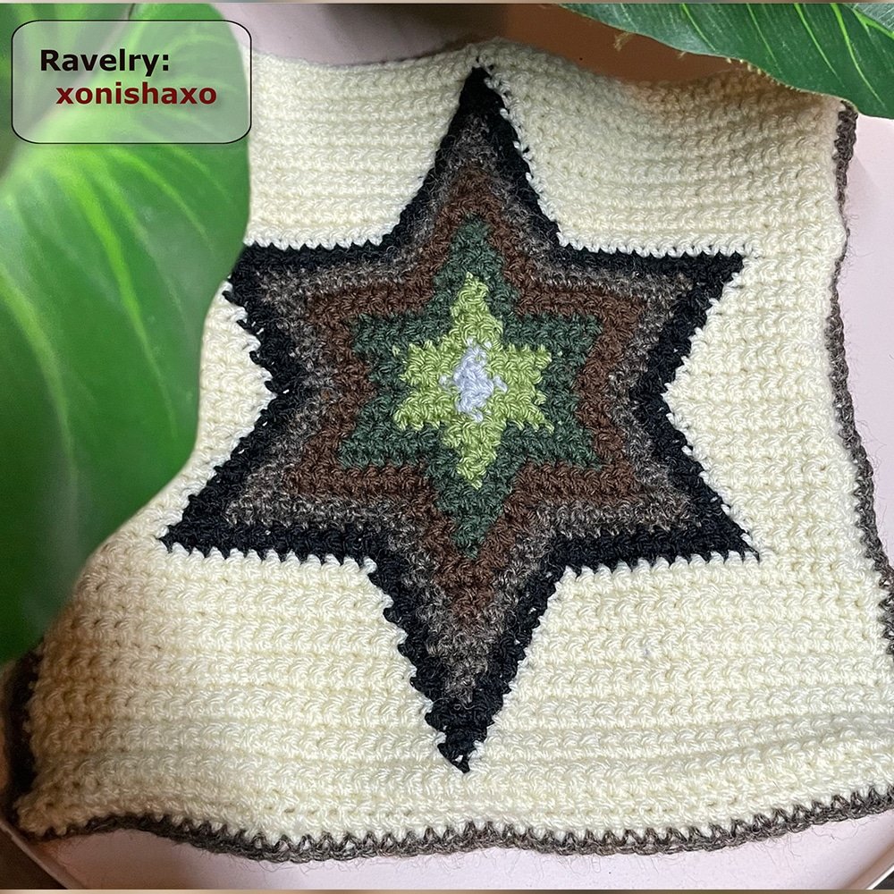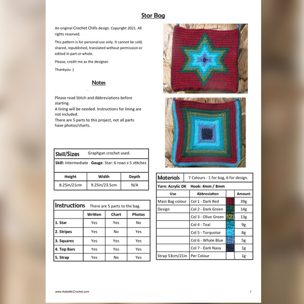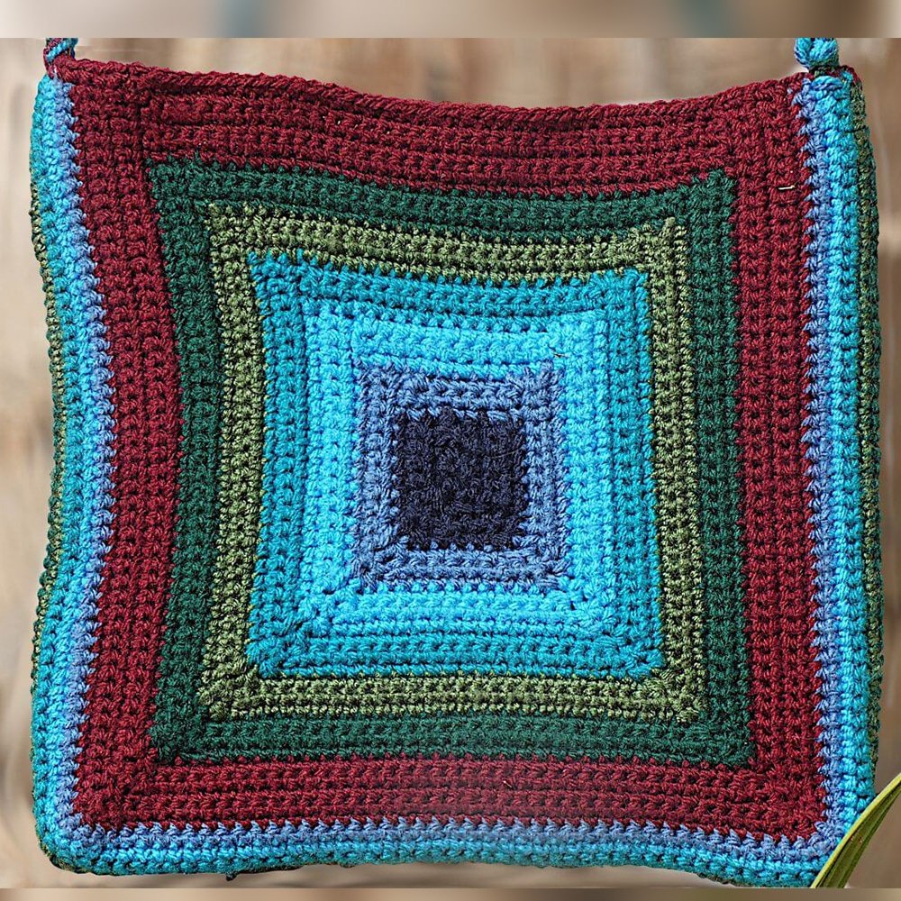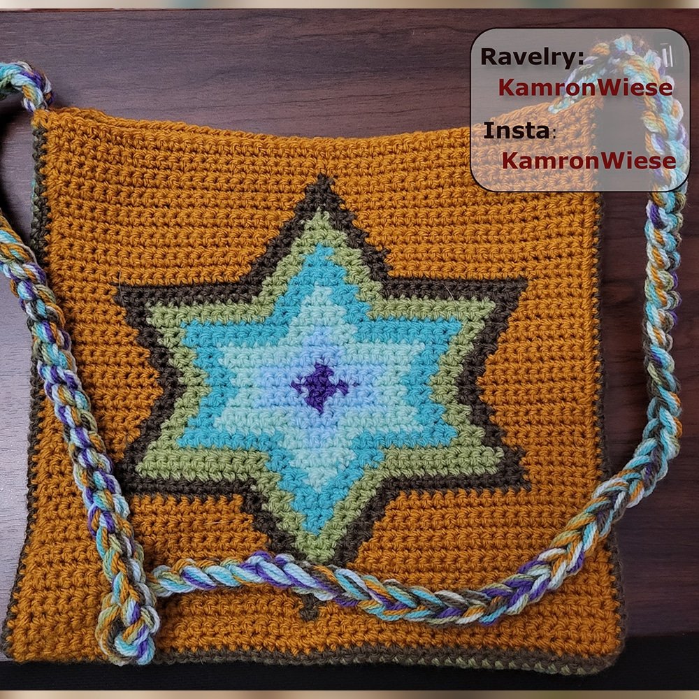 One side of the bag features a striking crochet star created using the graphgan method. Graphgan crochet, sometimes called a “graphghan,” uses a charted grid to work each stitch in a specific color, building up detailed designs row by row. The opposite side showcases concentric crochet squares made with regular crochet techniques, creating a balanced, versatile design.